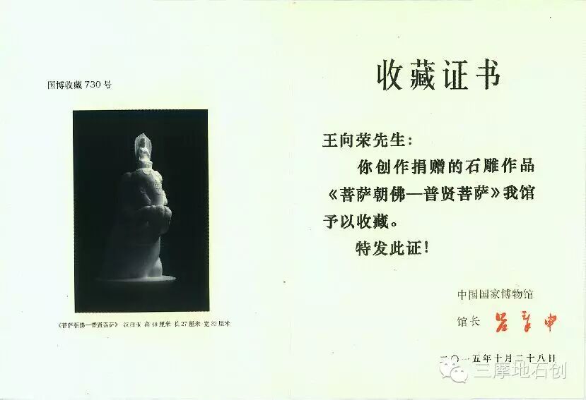 10月17—26日,“心造天成——中国惠安南派雕刻艺术展”在中国国家博物馆展出。此次展览由中国工艺美术协会、中国工艺美术学会和福建省惠安县人民政府联合主办,共计展出惠安55位雕刻家的108件石雕、木雕、玉雕精品以及若干大型雕刻工程案例。展览结束后,经专家推荐和鉴选,2015年10月30日,惠安12件雕艺佳作入藏国博,其中鼎立雕刻集团艺术总监、中国石雕艺术大师王向荣石雕新品《莲花天地·菩萨朝佛》之普贤菩萨荣幸被收藏。